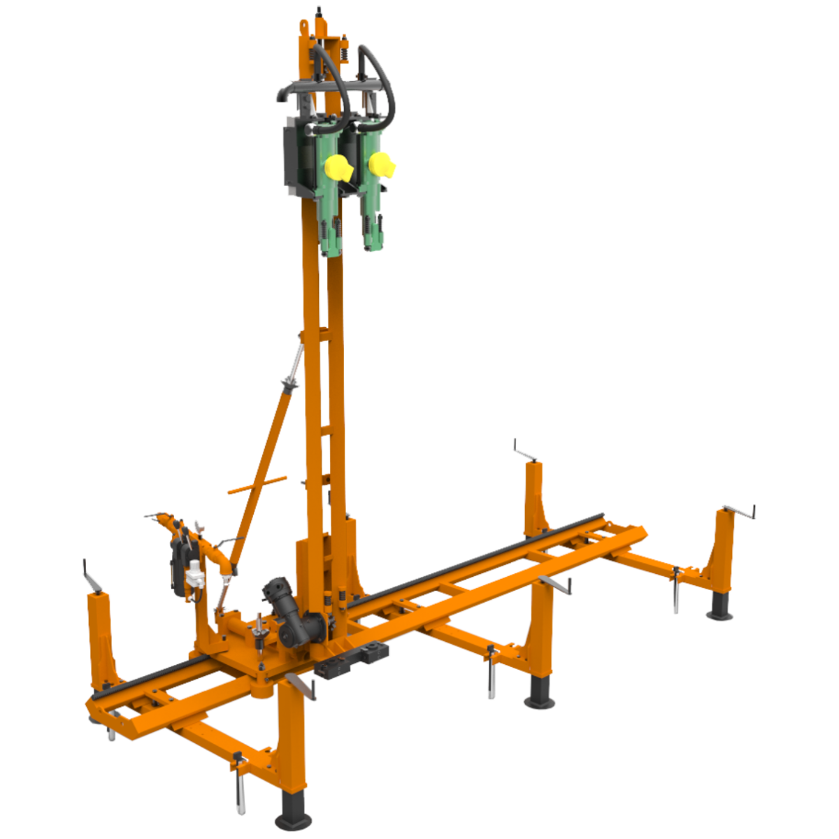 1.280 mm genişliğindeki ray ve ağır döküm makina, kesim sırasında yüksek denge sağlar. 1 HP servo motor hızlı pozisyonlama sağlar; ±250 mm yan hareketler 0,75 HP motorla, kafa dönüşü 1,5 HP motorla sağlanır. Tüm fonksiyonlar PLC destekli uzaktan panelle yönetilir. Makine, 3’er metrelik iki ray üzerinde çalışır.