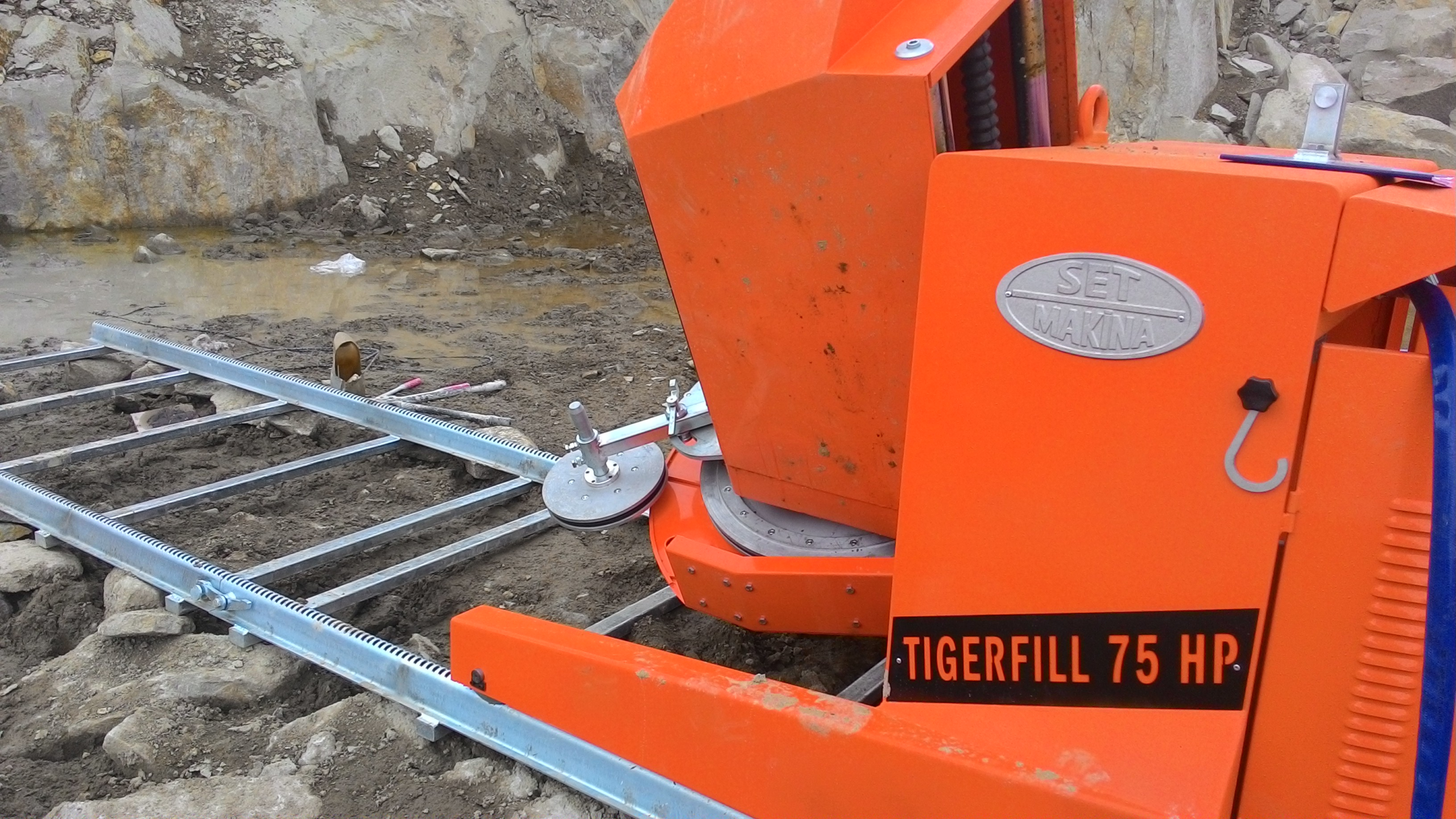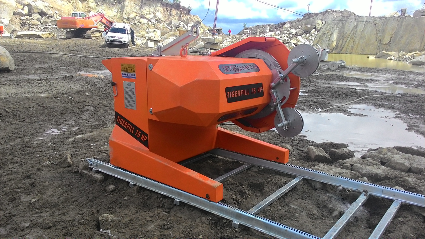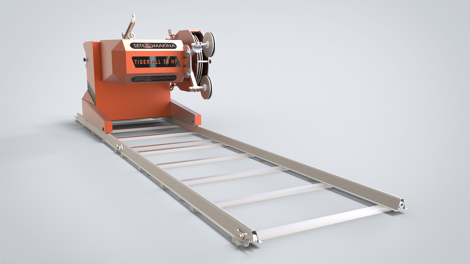 TIGERFILL, özellikle mermer ocakları için dağ kesme uygulamalarında kullanılan bir elmas tel kesme makinesidir. Dağ kesim makinası olarak konumlanan bu sistem, 50, 60, 75 veya 100 HP gücünde 6 kutuplu elektrik motorlarıyla çalışır. Yüksek kalkış torku sağlar ve 40 m/sn’ye kadar tel hızına ulaşır. Tel üzerindeki gerilim, özel bir elektronik kart ile sabit tutulur. Tel kopması veya arıza durumunda sistem otomatik olarak durur.
